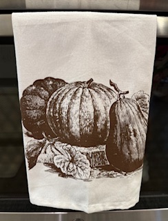 This 100%  white cotton dishtowel is adorned with beautifully inked, vintage style etched pumpkins in a rich espresso color. Perfect for adding a rustic, seasonal touch to your kitchen, it is both functional and decorative-ideal for drying dishes, lining a bread basket, or displaying as part of your fall decor.